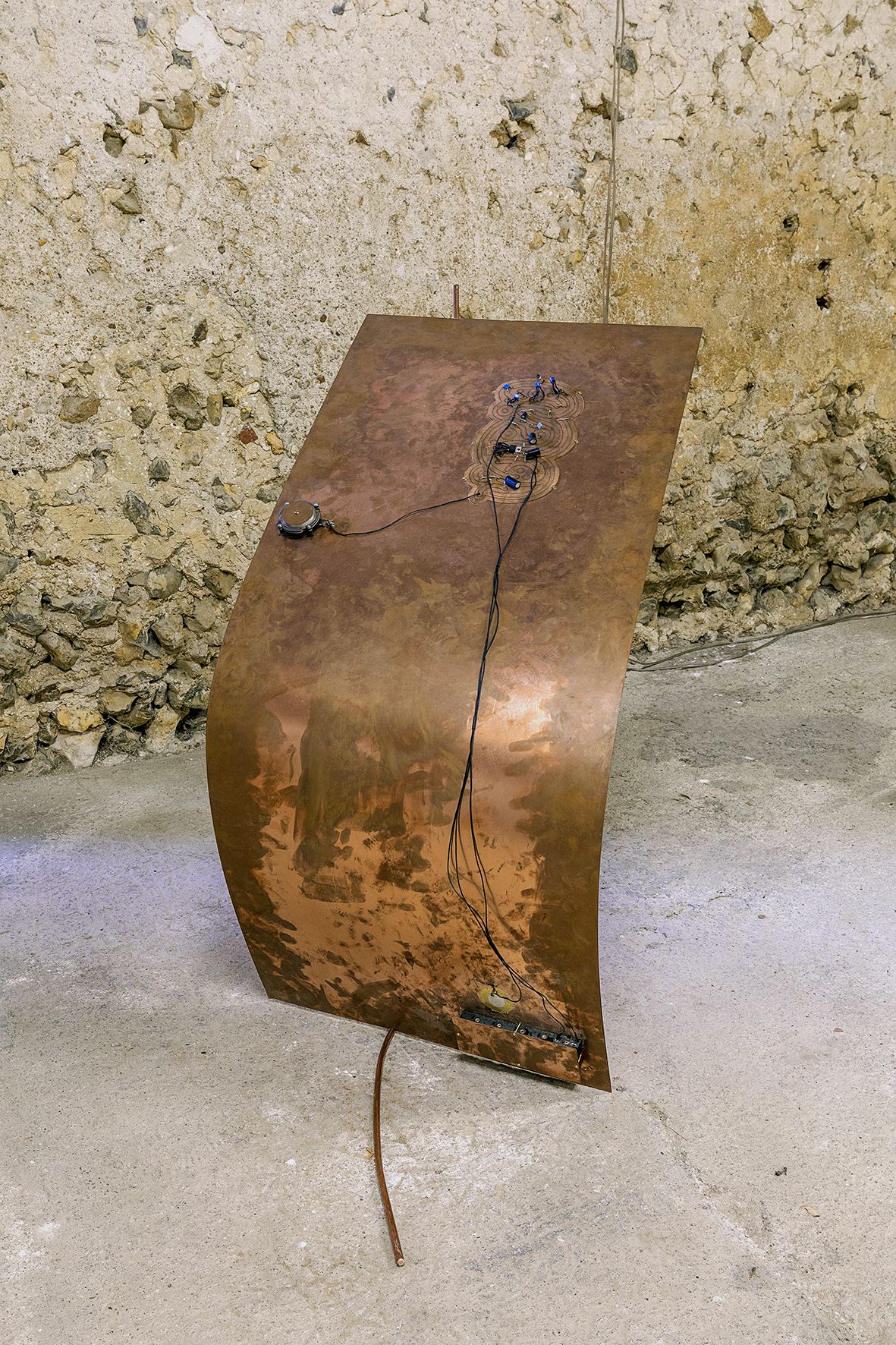 Sculptures, dim. variables, cuivre, micro piézo-électrique, transducteur, éléments électroniques. Film multicanal, son 7.1, 13 minutes.