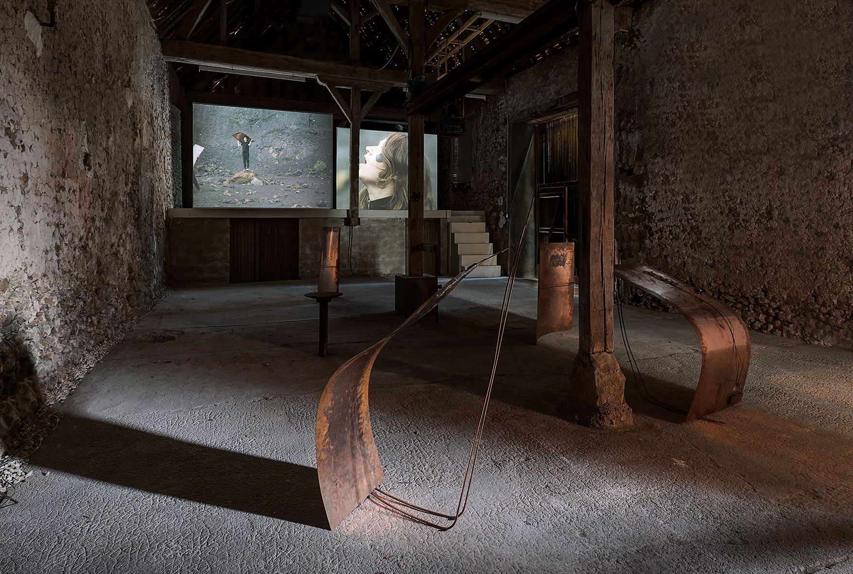Deux plans séquences issus du film Toutes ces filles couronnées de langues sont projetés en boucle. L’un montre la manipulation des instruments dans le paysage volcanique de Lanzarote, la manière dont ils entrent en interaction. On voit l’espace, l’immensité d’un cratère. L’autre montre les visages en plan serré des cinq performeuses. Elles se regardent, se touchent. Elles rient parfois. La caméra se promène dans la masse que forment ces cinq corps. On passe d’un visage à un autre, ils occupent toute l’image. La double projection met en miroir les deux scènes, paysage et groupe, le lien qui les unit: ces instruments qui leur permettent de communiquer.
