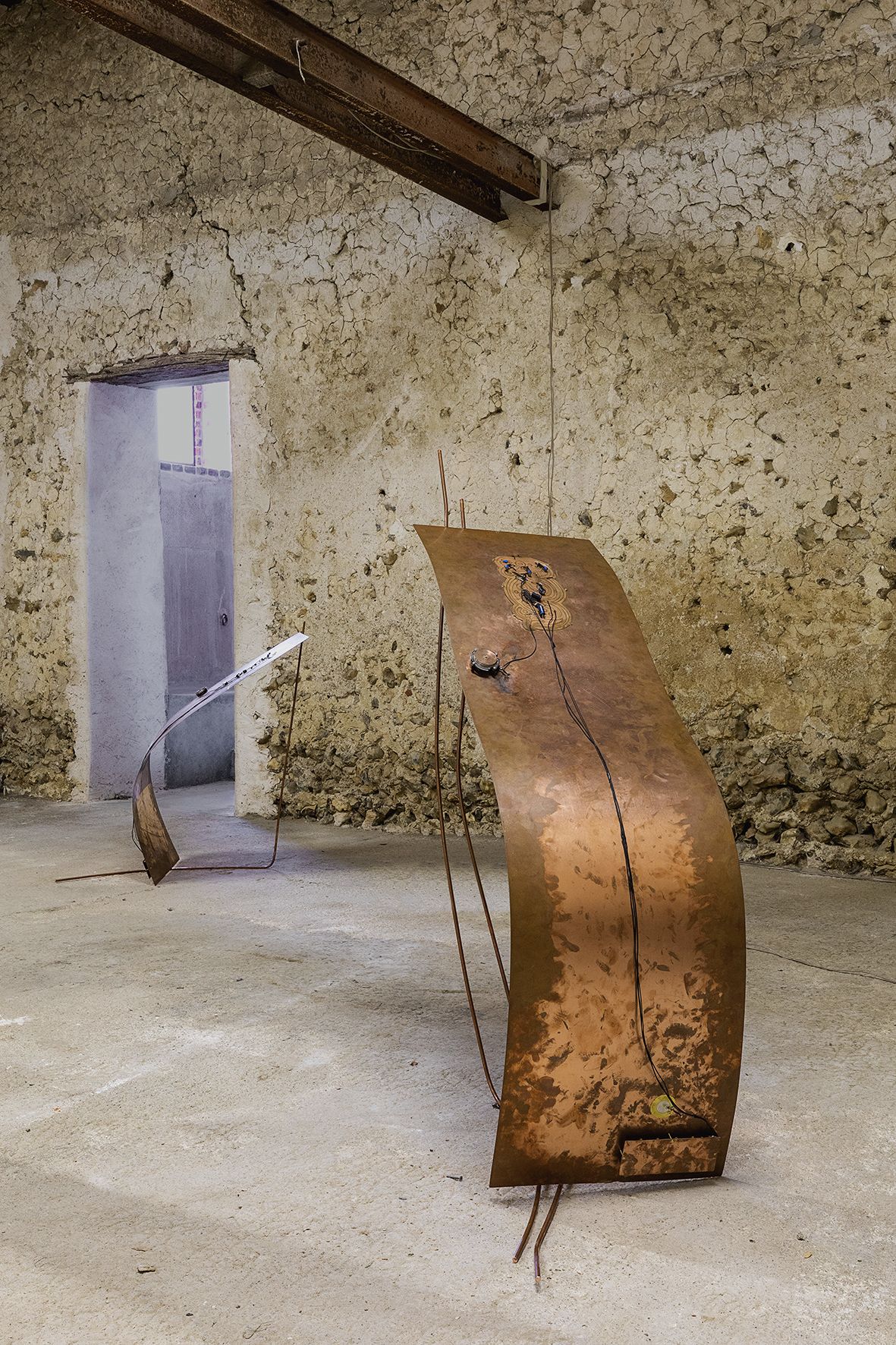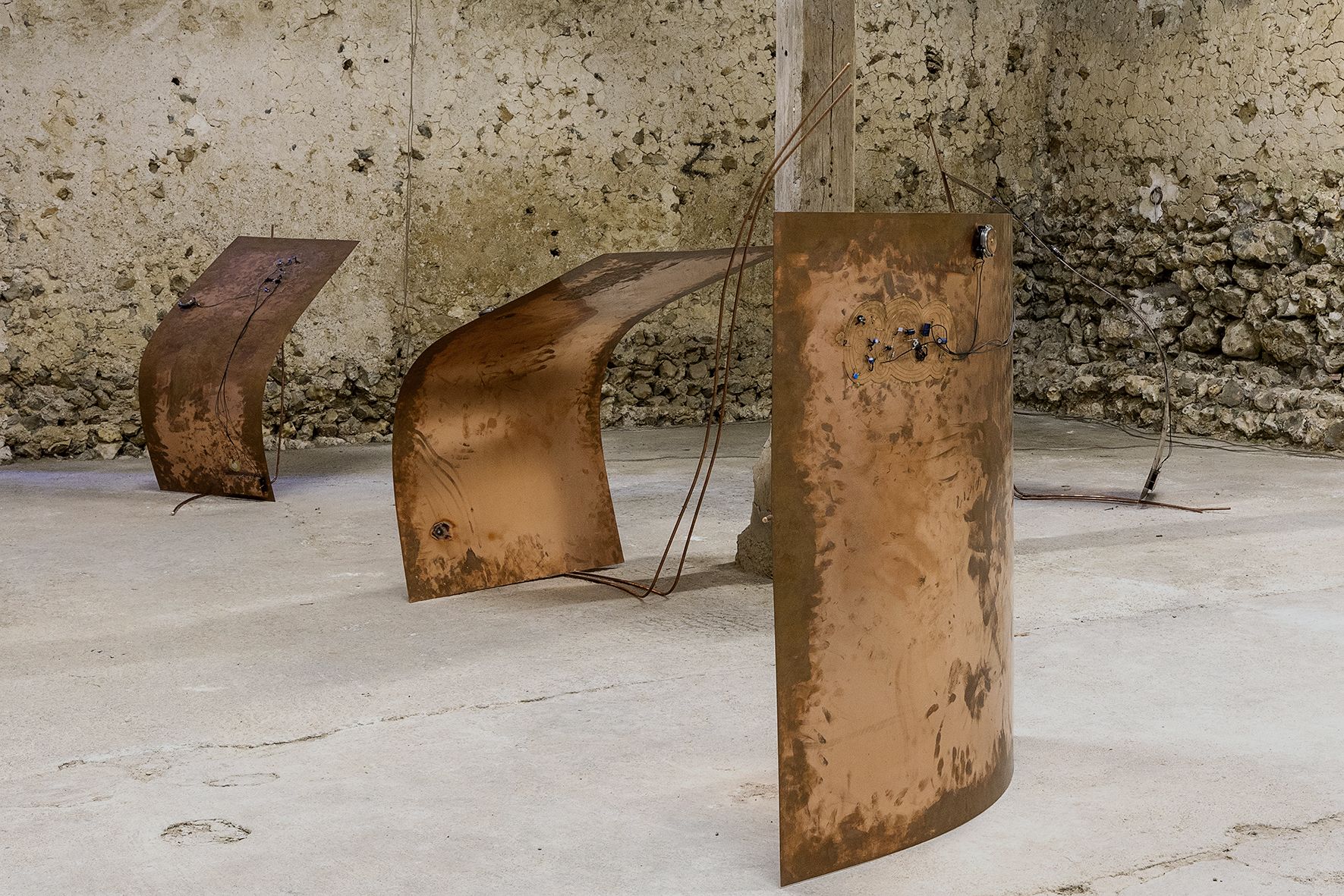 Sculptures, dim. variables, cuivre, micro piézo-électrique, transducteur, éléments électroniques. Film multicanal, son 7.1, 13 minutes.